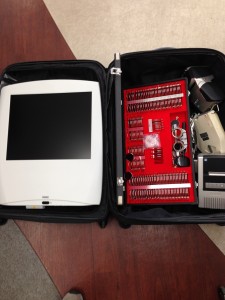 大きな、バッグに検眼用レンズ・ハンデーレフケラ・PDメーター・掛け枠・検査指標とフレーム20本が入ってます。その他カード決済用のスマートホン・プリンター・平成27年は、トレーサを持参してサービスの向上に努力したいと思います。